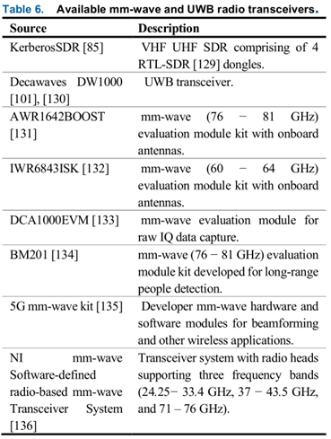 具有成本效益的传感器在 PoC 的快速开发和实验验证中发挥着关键作用。 Decawaves DW1000 [130] 是一种低成本的 UWB 收发器,可用于基于 UWB 的定位和本地化 [47],[137]。对于毫米波,德州仪器 [138] 和 Joybein [139] 提供了一些廉价的评估套件,可用于在现实场景中验证基于毫米波的定位和 SLAM 方法。评估套件 [131]、[132]、[134] 处理接收到的信号并提供 MPC 参数,例如距离、AoA、多普勒和 SNR。为了访问原始 IQ 数据样本,TI 提供了一个额外的 DCA1000EV M 套件 [133],它可以与 TI 的毫米波套件连接。访问原始 IQ 数据可以让研究人员开发和测试他们自己的自定义信号处理算法,用于室内定位和 radioSLAM。表 6 总结了一些可用于实施 PoC 的可用收发器。