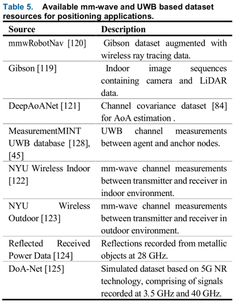 虽然一些数据集是公开可用的,但其他数据集需要购买订阅才能访问。表 5 总结了一些可用的数据集,可用于室内定位和无线电 SLAM 的应用。