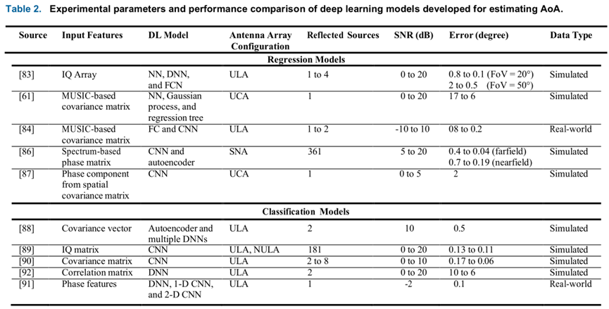 随着过去十年技术的最新进步,通过各种设备和数字平台生成了大量数据。数据的爆发带来了人工智能 (AI) 的全新时代,其中包含数据驱动的算法,其性能似乎可以取代传统的信号处理算法。基于 NN 的 DL 算法 [78] 在计算机视觉 [79]、自然语言处理 [80] 以及最近的无线通信应用 [81] 领域变得非常流行。事实上,许多研究人员现在正试图利用 DL 的潜力来估计室内定位应用的 AoA。设计用于 AoA 估计的 DL 模型有两种方法:回归和分类。表 2 列出了一些为优化 AoA 估计而设计的基于回归和分类的 DL 模型。然而,值得注意的是,表 2 中列出的每个实验都考虑了一组不同的实验参数,例如源反射器的数量、视场 (FoV)、信噪比 (SNR)、以及接收器的天线阵列配置,例如 ULA、非均匀线性阵列 (NULA)、均匀圆形阵列 (UCA) 和对称嵌套阵列 (SNA)。因此,AoA 估计的性能根据实验中使用的参数集而变化。下面的小节将进一步讨论基于回归和分类的方法。