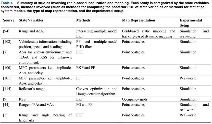 构建地图是 SLAM 中最具挑战性的任务之一。由于环境(无论是室内还是室外)通常具有丰富的特征,因此开发一个可以处理高维数据并且还可以区分用于识别某些感兴趣的地标的几个特征的方法。然而,表示环境的基本类别有两种,即基于特征的地图和占用网格地图(OGM)。每种映射技术都经过专门设计,可在使用某些传感器和特定环境场景时发挥最佳效果 [115]。表 4 总结了现有无线电 SLAM 实现中涉及的方法和映射表示。