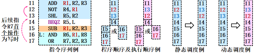1)保持数据流:可跨基本块调度(静态(如编译时可多次扫描【软件】/动态(流水预测法)),须不影响执行结果