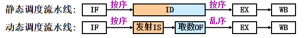 - 在程序执行过程中,依靠专门的硬件对代码进行调度。可以在保持数据流和异常行为的情况下,通过硬件对指令执行顺序进行重安排,减少相关导致的停顿(用硬件的复杂性换指令高效执行)