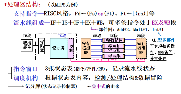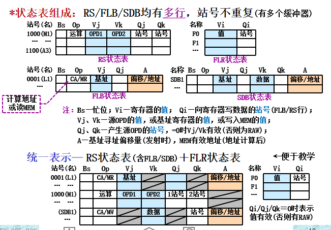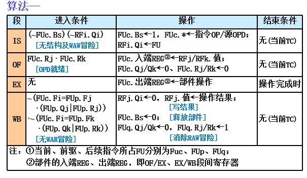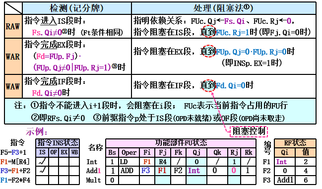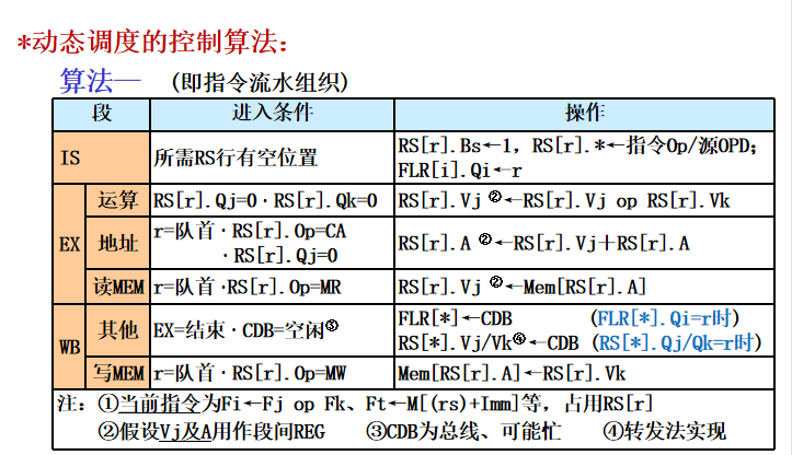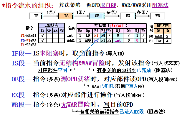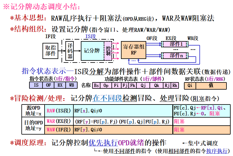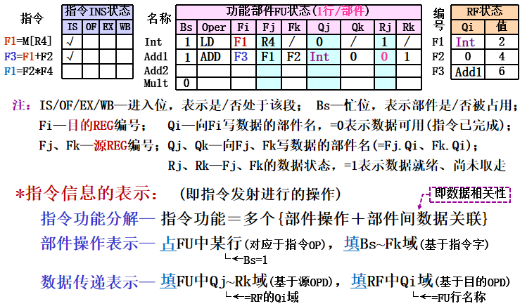 - 状态表组成:指令状态表(流水状态、部件状态表(OP/源OPD部件状态)、RF状态表(目的OPD部件状态)