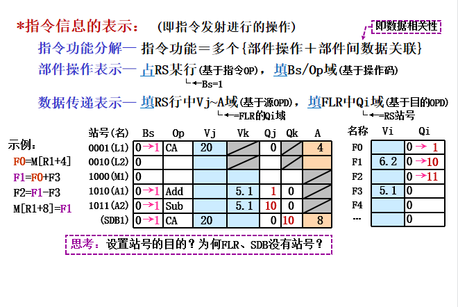 另外要完成对目的寄存器的预约工作,将之设置为接受保留站r的结果。实际上相当于提前完成了写操作(预约)。由于指令按程序顺序流出,当出现多条指令写同一个结果寄存器是,最后留下的预约结果肯定是最后一条指令的,相当于消除了WAW冲突、