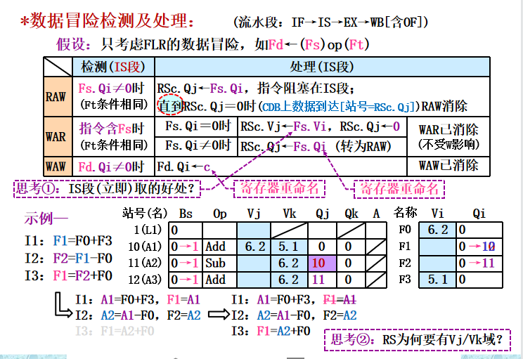 IS:从指令队列头部取出一条指令,若该指令的操作所要求的操作数在寄存器已经就绪,就把这些操作数送入保留站r。如果还没就绪,就把将要产生该操作数的标识送入保留站r。这样,一旦被记录的保留站完成了计算,它就把数据直接送给保留站r。这一步实际上就进行了寄存器换名的操作(换成保留站的标识)和对操作数进行了缓冲,消除了WAR冲突。