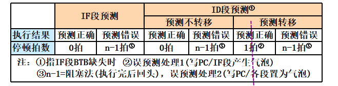 - 分支预测时机:IF段(不停顿)、ID段(停一拍)