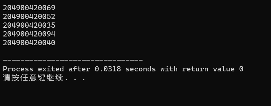 #include <stdio.h> #include <stdlib.h> #include <time.h> #define N 5 int main() { int number; int i; srand(time(0)); // 以当前系统时间作为随机种子 for(i = 0; i < N; ++i) { number = rand() % 100 + 1; printf("20490042%04d\n", number); } return 0; }