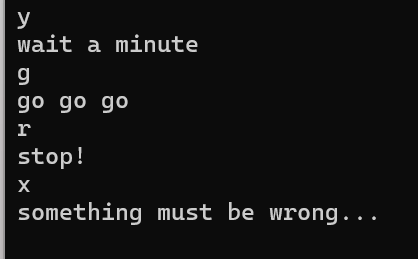 #include <stdio.h> int main() { char input; while (1){ scanf(" %c",&input) ; switch (input) { case 'r': case 'R': printf("stop!\n"); break; case 'g': case 'G': printf("go go go\n"); break; case 'y': case 'Y': printf("wait a minute\n"); break; default: printf("something must be wrong...\n"); break; } if (getchar() == EOF) { break; } } return 0; }