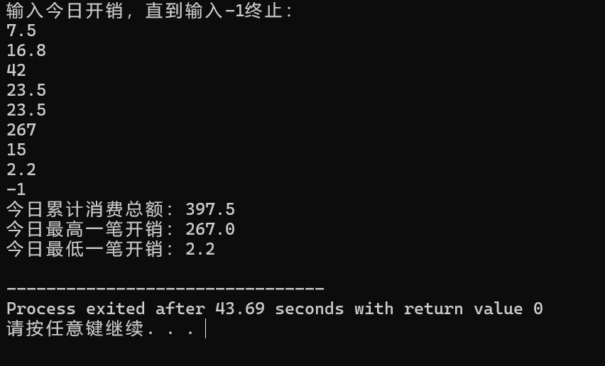 #include <stdio.h> int main(){ float expense, max = 0.0, min = 20000.0, total = 0.0; printf("输入今日开销,直到输入-1终止:\n"); while(1) { scanf("%f",&expense); if(expense == -1){ break; } total += expense; if (expense > max) { max = expense; } if (expense < min) { min = expense; } scanf("\n"); } printf("今日累计消费总额:%.1f\n", total); printf("今日最高一笔开销:%.1f\n", max); printf("今日最低一笔开销:%.1f\n", min); return 0; }