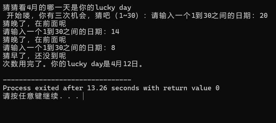 #include <stdio.h> #include <stdlib.h> int main(){ int d,g; d = rand() % 30 + 1; int n=0; printf("猜猜看4月的哪一天是你的lucky day\n 开始喽,你有三次机会,猜吧(1~30):"); while (n<3) { printf("请输入一个1到30之间的日期:"); scanf("%d", &g); if (g == d) { printf("哇,猜中了"); break; } else if (g < d) { printf("猜早了,还没到呢\n"); } else { printf("猜晚了,在前面呢\n"); } n++ ; if (n == 3) { printf("次数用完了。你的lucky day是4月%d日。\n", d); } } return 0; }