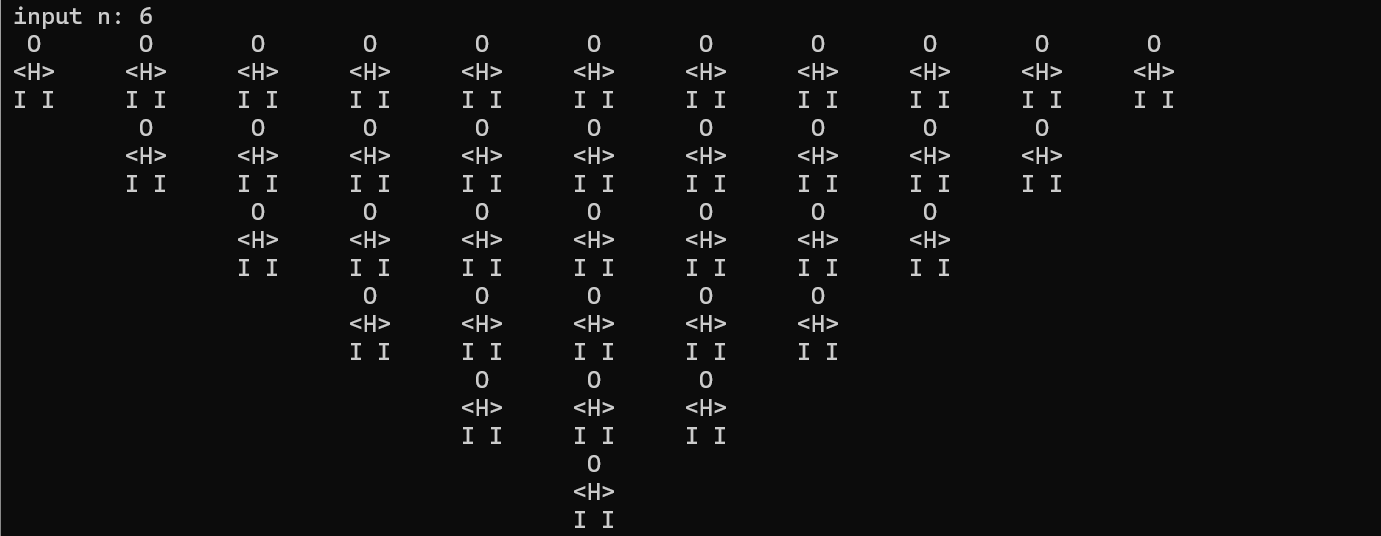 #include <stdio.h> void printCharacter(int n) { for (int i = n; i > 0; i--) { for (int j = 0; j < n - i; j++) { printf(" \t"); } for (int j = 0; j < 2 * i - 1; j++) { printf(" O\t"); } printf("\n"); for (int j = 0; j < n - i; j++) { printf("\t"); } for (int j = 0; j < 2 * i - 1; j++) { printf("<H>\t"); } printf("\n"); for (int j = 0; j < n - i; j++) { printf("\t"); } for (int j = 0; j < 2 * i - 1; j++) { printf("I I\t"); } printf("\n"); } } int main() { int n; printf("input n: "); scanf("%d", &n); printCharacter(n); return 0; }