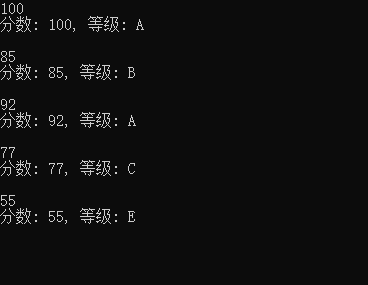 #include <stdio.h> char score_to_grade(int score); int main() { int score; char grade; while(scanf("%d", &score) != EOF) { grade = score_to_grade(score); printf("分数: %d, 等级: %c\n\n", score, grade); } return 0; } char score_to_grade(int score) { char ans; switch(score/10) { case 10: case 9: ans = 'A'; break; case 8: ans = 'B'; break; case 7: ans = 'C'; break; case 6: ans = 'D'; break; default: ans = 'E'; } return ans; }