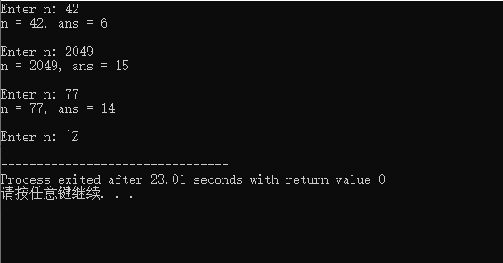 #include <stdio.h> int sum_digits(int n); // 函数声明 int main() { int n; int ans; while(printf("Enter n: "), scanf("%d", &n) != EOF) { ans = sum_digits(n); // 函数调用 printf("n = %d, ans = %d\n\n", n, ans); } return 0; } // 函数定义 int sum_digits(int n) { int ans = 0; while(n != 0) { ans += n % 10; n /= 10; } return ans; }