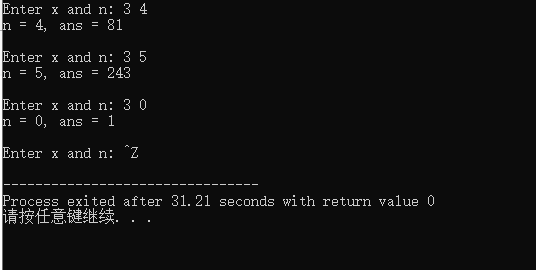 #include <stdio.h> int power(int x, int n); // 函数声明 int main() { int x, n; int ans; while(printf("Enter x and n: "), scanf("%d%d", &x, &n) != EOF) { ans = power(x, n); // 函数调用 printf("n = %d, ans = %d\n\n", n, ans); } return 0; } // 函数定义 int power(int x, int n) { int t; if(n == 0) return 1; else if(n % 2) return x * power(x, n-1); else { t = power(x, n/2); return t*t; } }