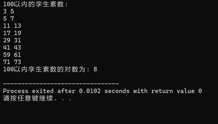 #include <stdio.h> int is_prime(int n) { if (n <= 1) { return 0; } for (int i = 2; i <= sqrt(n); i++) { if (n % i == 0) { return 0; } } return 1; } int main() { int count = 0; printf("100以内的孪生素数: \n"); for (int n = 2; n <= 98; n++) { if (is_prime(n) && is_prime(n + 2)) { printf("(%d, %d)\n", n, n + 2); count++; } } printf("100以内孪生素数的对数为: %d\n", count); return 0; }