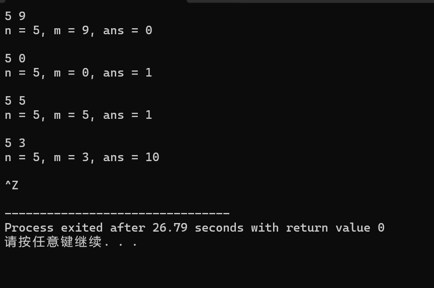 #include <stdio.h> // 函数定义 int func(int n, int m) { int ans = 1; for (int i = n; i > n - m; i--) { ans *= i; } for (int i = 1; i <= m; i++) { ans /= i; } return ans; } int main() { int n, m; int ans; while (scanf("%d%d", &n, &m) != EOF) { ans = func(n, m); printf("n = %d, m = %d, ans = %d\n\n", n, m, ans); } return 0; } // 函数定义 // 待补足。。。(分别用迭代和递归实现)