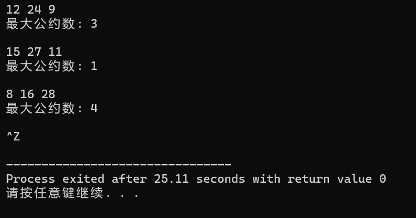 #include <stdio.h> int gcd(int a,int b,int c); int i; // 函数声明 // 待补足.... int main() { int a, b, c; int ans; while(scanf("%d%d%d", &a, &b, &c) != EOF) { ans = gcd(a, b, c); // 函数调用 printf("最大公约数: %d\n\n", ans); } return 0; } int gcd(int a, int b, int c) { int i; if (a <= b && a <= c) { i = a; } else if (b <= a && b <= c) { i = b; } else { i = c; } int ans = 1; for (int j = 1; j <= i; j++) { if (a % j == 0 && b % j == 0 && c % j == 0) { ans = j; } } return ans; }