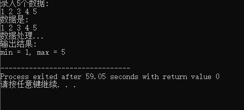 #include <stdio.h> #define N 5 void input(int x[], int n); void output(int x[], int n); void find_min_max(int x[], int n, int *pmin, int *pmax); int main() { int a[N]; int min, max; printf("录入%d个数据:\n", N); input(a, N); printf("数据是: \n"); output(a, N); printf("数据处理...\n"); find_min_max(a, N, &min, &max); printf("输出结果:\n"); printf("min = %d, max = %d\n", min, max); return 0; } void input(int x[], int n) { int i; for(i = 0; i < n; ++i) scanf("%d", &x[i]); } void output(int x[], int n) { int i; for(i = 0; i < n; ++i) printf("%d ", x[i]); printf("\n"); } void find_min_max(int x[], int n, int *pmin, int *pmax) { int i; *pmin = *pmax = x[0]; for(i = 0; i < n; ++i) if(x[i] < *pmin) *pmin = x[i]; else if(x[i] > *pmax) *pmax = x[i]; }