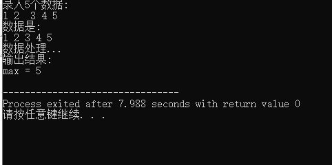 #include <stdio.h> #define N 5 void input(int x[], int n); void output(int x[], int n); int *find_max(int x[], int n); int main() { int a[N]; int *pmax; printf("录入%d个数据:\n", N); input(a, N); printf("数据是: \n"); output(a, N); printf("数据处理...\n"); pmax = find_max(a, N); printf("输出结果:\n"); printf("max = %d\n", *pmax); return 0; } void input(int x[], int n) { int i; for(i = 0; i < n; ++i) scanf("%d", &x[i]); } void output(int x[], int n) { int i; for(i = 0; i < n; ++i) printf("%d ", x[i]); printf("\n"); } int *find_max(int x[], int n) { int max_index = 0; int i; for(i = 0; i < n; ++i) if(x[i] > x[max_index]) max_index = i; return &x[max_index]; }