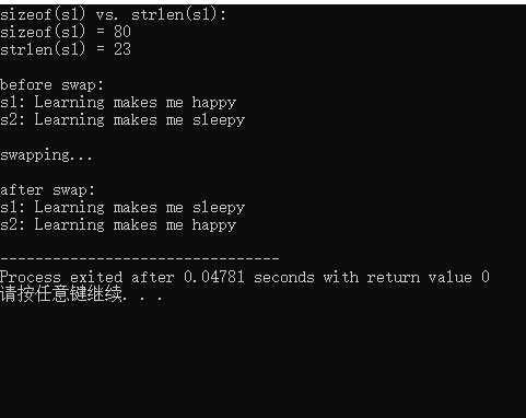 #include <stdio.h> #include <string.h> #define N 80 int main() { char *s1 = "Learning makes me happy"; char *s2 = "Learning makes me sleepy"; char *tmp; printf("sizeof(s1) vs. strlen(s1): \n"); printf("sizeof(s1) = %d\n", sizeof(s1)); printf("strlen(s1) = %d\n", strlen(s1)); printf("\nbefore swap: \n"); printf("s1: %s\n", s1); printf("s2: %s\n", s2); printf("\nswapping...\n"); tmp = s1; s1 = s2; s2 = tmp; printf("\nafter swap: \n"); printf("s1: %s\n", s1); printf("s2: %s\n", s2); return 0; }
