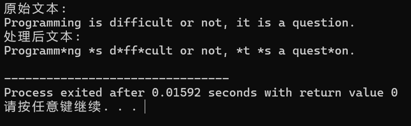 #include <stdio.h> #define N 80 void replace(char *str, char old_char, char new_char); // 函数声明 int main() { char text[N] = "Programming is difficult or not, it is a question."; printf("原始文本: \n"); printf("%s\n", text); replace(text, 'i', '*'); // 函数调用 注意字符形参写法,单引号不能少 printf("处理后文本: \n"); printf("%s\n", text); return 0; } // 函数定义 void replace(char *str, char old_char, char new_char) { int i; while(*str) { if(*str == old_char) *str = new_char; str++; } }