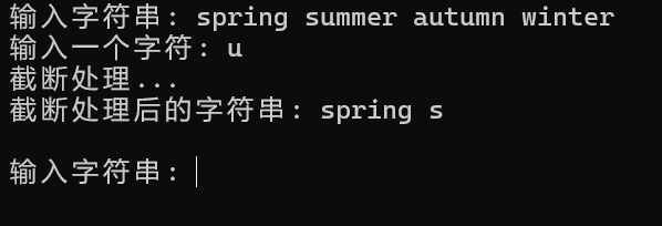 #include <stdio.h> #define N 80 char *str_trunc(char *str, char x); int main() { char str[N]; char ch; int i; while(printf("输入字符串: "), gets(str) != NULL) { for(i=0; str[i] != '\0'; i++) { if (str[i] == '\n') { str[i] = '\0'; break; } } printf("输入一个字符: "); ch = getchar(); printf("截断处理...\n"); str_trunc(str, ch); // 函数调用 printf("截断处理后的字符串: %s\n\n", str); getchar(); } return 0; } char *str_trunc(char *str, char x) { int i; for (i = 0; str[i] != '\0'; i++) { if (str[i] == x) { str[i] = '\0'; break; } } return str; }