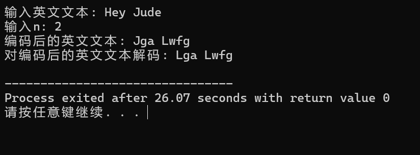 #include <stdio.h> #define N 80 void encoder(char *str, int n); // 函数声明 void decoder(char *str, int n); // 函数声明 int main() { char words[N]; int n; printf("输入英文文本: "); gets(words); printf("输入n: "); scanf("%d", &n); printf("编码后的英文文本: "); encoder(words, n); // 函数调用 printf("%s\n", words); printf("对编码后的英文文本解码: "); decoder(words, n); // 函数调用 printf("%s\n", words); return 0; } /*函数定义 功能:对s指向的字符串进行编码处理 编码规则: 对于a~z或A~Z之间的字母字符,用其后第n个字符替换; 其它非字母字符,保持不变 */ void encoder(char *str, int n) { while (*str){ if (isalpha(*str)) { char base = (*str >= 'a' && *str <= 'z') ? 'a' : 'A'; *str = (char)(((*str - base + n) % 26) + base); } str++; } } /*函数定义 功能:对s指向的字符串进行解码处理 解码规则: 对于a~z或A~Z之间的字母字符,用其前面第n个字符替换; 其它非字母字符,保持不变 */ void decoder(char *str, int n) { if (isalpha(*str)) { char base = (*str >= 'a' && *str <= 'z') ? 'a' : 'A'; *str = (char)(((*str - base + n) % 26) + base); } str++; }