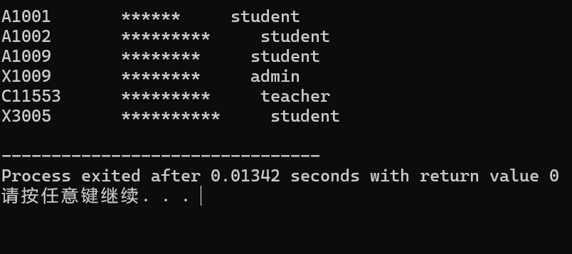 void output(Account x[], int n); // 输出账户数组x中n个账户信息,其中,密码用*替代显示