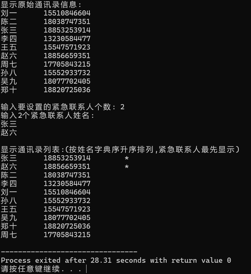 void display(Contact x[], int n); // 按联系人姓名字典序升序显示信息,紧急联系人最先显示