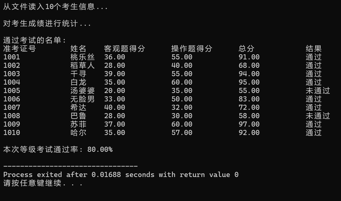 printf("\n本次等级考试通过率: %.2f%%\n", pass_rate*100);