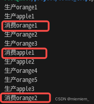 输出结果如图,消费者按生产者放入队列缓冲区的水果顺序从队列中取出可消费的水果。