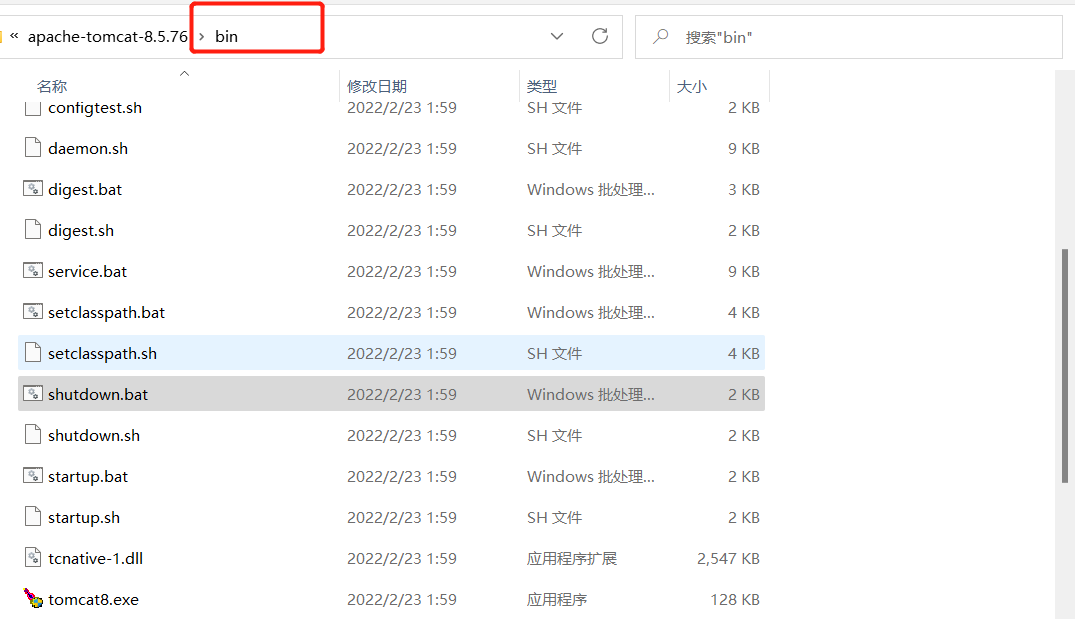 ➢ bin:存放启动和关闭 Tomcat 的脚本文件。*.sh 文件用于 Unix 系统;*.bat 文件用于 Win