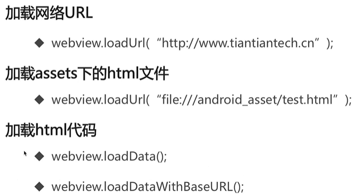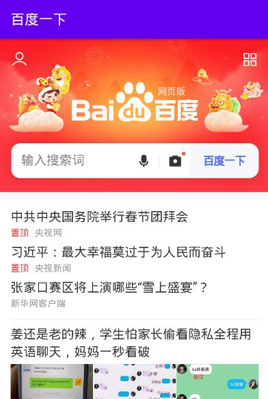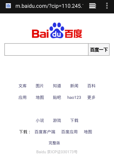 1 public class WebViewActivity extends AppCompatActivity { 2 private WebView WVmain; 3 @Override 4 protected void onCreate(Bundle savedInstanceState) { 5 super.onCreate(savedInstanceState); 6 setContentView(R.layout.activity_web_view); 7 WVmain=findViewById(R.id.wv); 8 //加载本地Html,这是在main下创建new——>Folder——>AssetsFolder这样创建的文件,并把写好的html文件放在该目录下 9 //WVmain.loadUrl("file:///android_asset/test.html");//约定好的路径,千万注意别写错,是android_asset,没有加s,也要加android 10 //加载网络Url 11 WVmain.getSettings().setJavaScriptEnabled(true);//如果打不开网页的话加这句话就可以了,能打开,加上和不加这句话页面还是不太一样的,但是加上更好 12 WVmain.setWebViewClient(new MyWebViewClient()); 13 WVmain.setWebChromeClient(new MyWebChromeClient());//注意new后面的要和底下class的名称一样的,别写错 14 WVmain.loadUrl("https://m.baidu.com");//一般移动站点都需要加一个m. 15 } 16 17 class MyWebViewClient extends WebViewClient{ 18 @Override 19 public boolean shouldOverrideUrlLoading(WebView view, WebResourceRequest request) { 20 view.loadUrl(request.getUrl().toString()); 21 return true; 22 }//控制其不使用其他的浏览器加载,只使用当前浏览器加载 23 24 @Override 25 public void onPageStarted(WebView view, String url, Bitmap favicon) { 26 super.onPageStarted(view, url, favicon); 27 Log.d("WebView", "onPageStarted..."); 28 } 29 30 @Override 31 public void onPageFinished(WebView view, String url) { 32 super.onPageFinished(view, url); 33 Log.d("WebView", "onPageFinished..."); 34 //WVmain.loadUrl("javascript:alert('Hello!')");//在页面加载结束后弹出提示框 35 WVmain.evaluateJavascript("javascript:alert('Hello!')",null);//这个同样可以弹出对话框,效果相同 36 } 37 } 38 39 @Override 40 public boolean onKeyDown(int keyCode, KeyEvent event) { 41 if(keyCode==KeyEvent.KEYCODE_BACK&&WVmain.canGoBack()){//条件:返回键并且可以返回 42 WVmain.goBack(); 43 return true; 44 } 45 return super.onKeyDown(keyCode, event); 46 }//设置按手机底部返回键时,不是直接退回到activity页面,而是在浏览器中退回到上一级 47 48 class MyWebChromeClient extends WebChromeClient { 49 @Override 50 public void onProgressChanged(WebView view, int newProgress) { 51 super.onProgressChanged(view, newProgress); 52 }//显示进度条 53 54 @Override 55 public void onReceivedTitle(WebView view, String title) { 56 super.onReceivedTitle(view, title); 57 setTitle(title); 58 }//将当前网页的title设置为当前的title 59 } 60 }