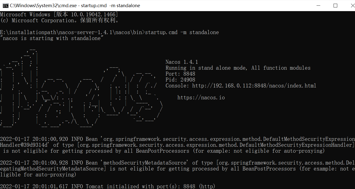 再次启动(如果端口被占用,需要修改端口,默认8848)