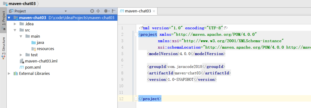 文本编辑器打开maven-chat03/pom.xml,将下面内容贴进去: