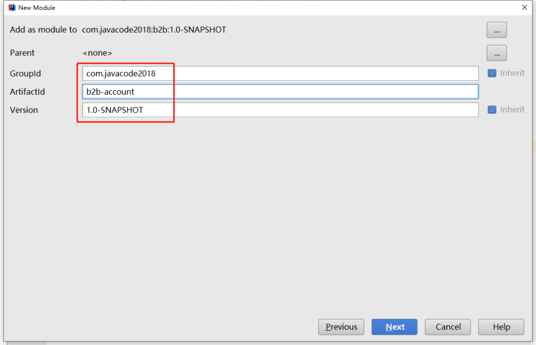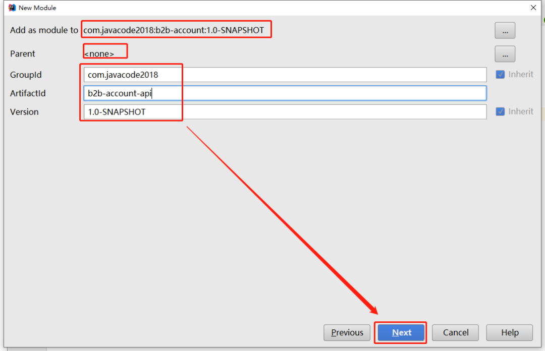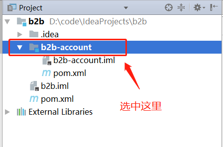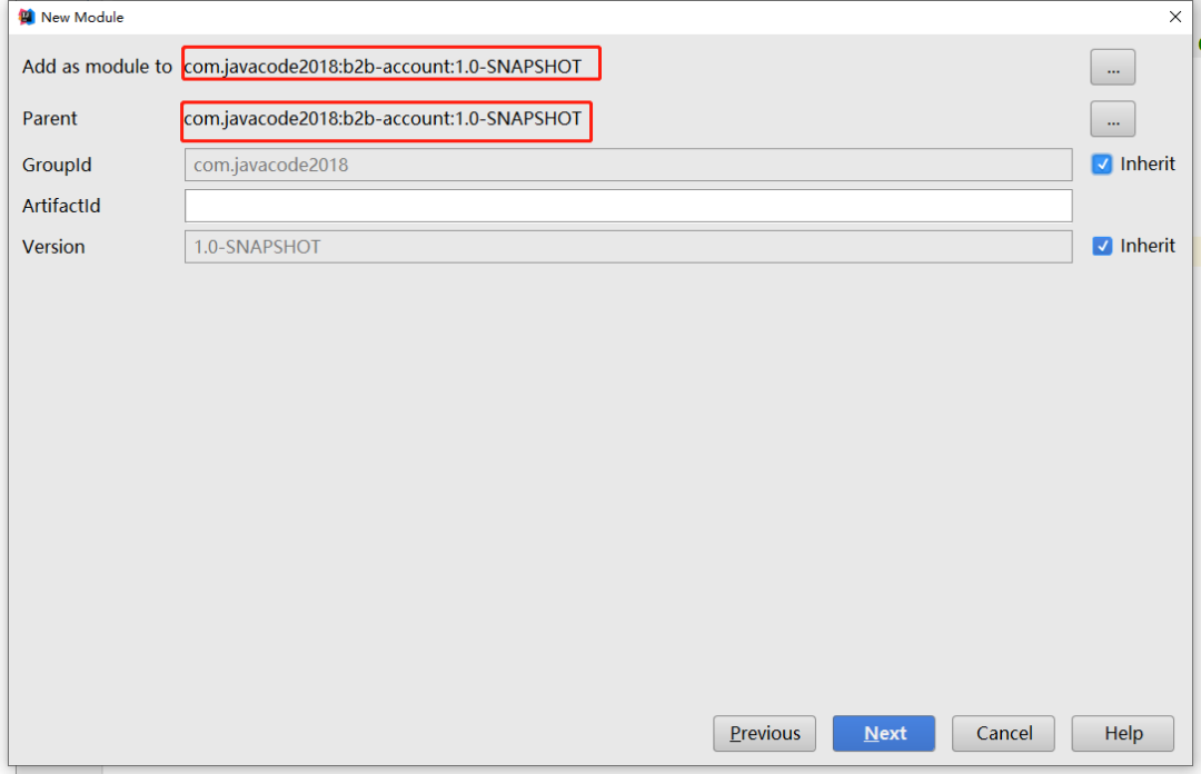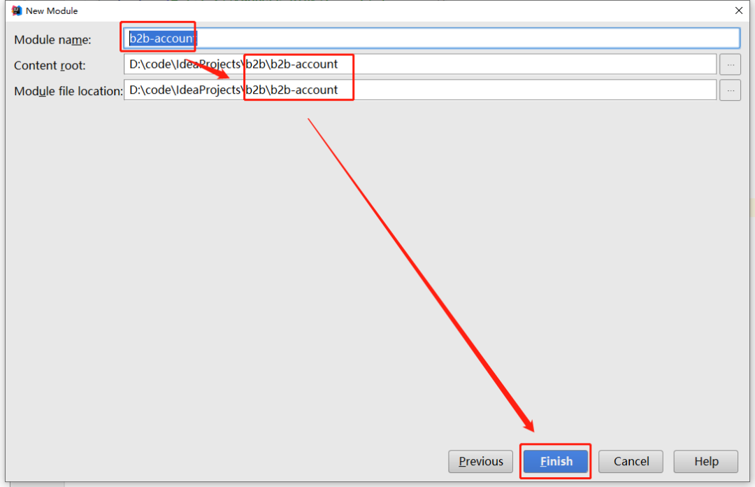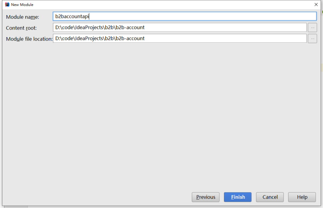 将上面的Add as module to设置为b2b-account模块,表示新增的这个模块被b2b-account聚合进行管理。
