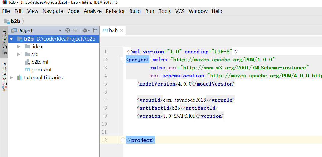 <?xml version="1.0" encoding="UTF-8"?> <project xmlns="http://maven.apache.org/POM/4.0.0" xmlns:xsi="http://www.w3.org/2001/XMLSchema-instance" xsi:schemaLocation="http://maven.apache.org/POM/4.0.0 http://maven.apache.org/xsd/maven-4.0.0.xsd"> <modelVersion>4.0.0</modelVersion> <groupId>com.javacode2018</groupId> <artifactId>b2b</artifactId> <packaging>pom</packaging> <version>1.0-SNAPSHOT</version> <modules> <module>b2b-account</module> <module>b2b-order</module> </modules> </project>