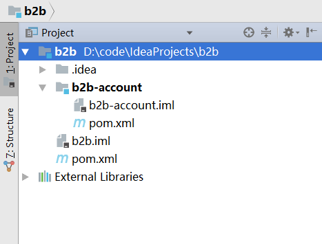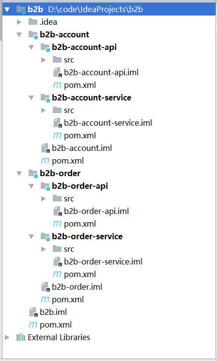 b2b_account和b2b_order,这3个package都是pom。b2b_account中包含了2个子模块,2个子模块package是默认的jar类型。