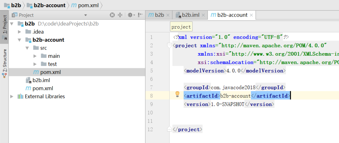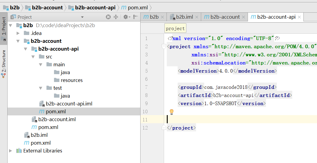 <?xml version="1.0" encoding="UTF-8"?> <project xmlns="http://maven.apache.org/POM/4.0.0" xmlns:xsi="http://www.w3.org/2001/XMLSchema-instance" xsi:schemaLocation="http://maven.apache.org/POM/4.0.0 http://maven.apache.org/xsd/maven-4.0.0.xsd"> <modelVersion>4.0.0</modelVersion> <groupId>com.javacode2018</groupId> <artifactId>b2b-account</artifactId> <packaging>pom</packaging> <version>1.0-SNAPSHOT</version> <modules> <module>b2b-account-api</module> <module>b2b-account-service</module> </modules> </project>