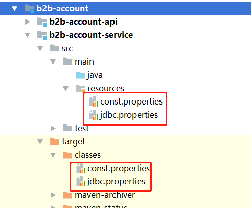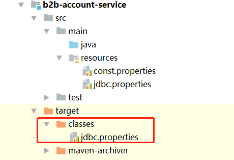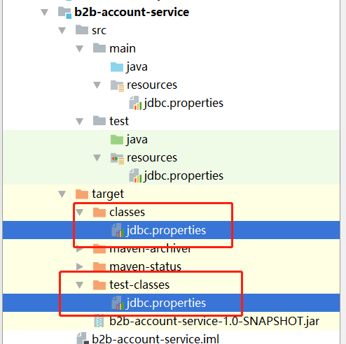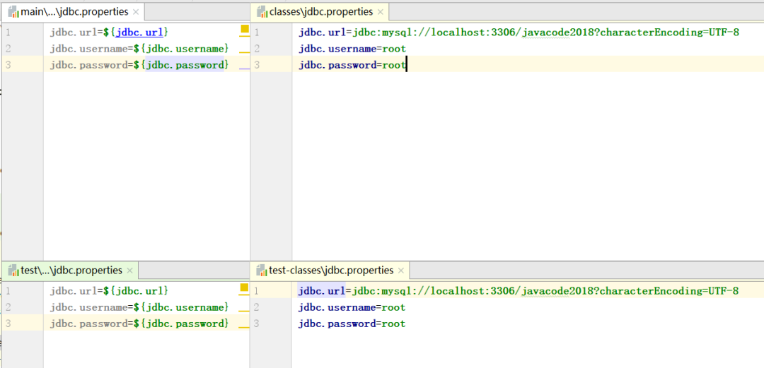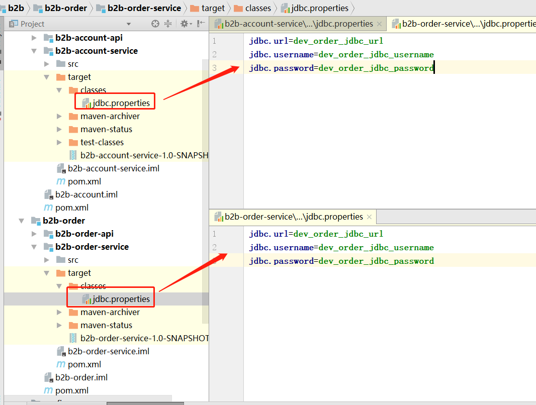 看一下两个模块target/classes下面jdbc.properties内容,如下图: