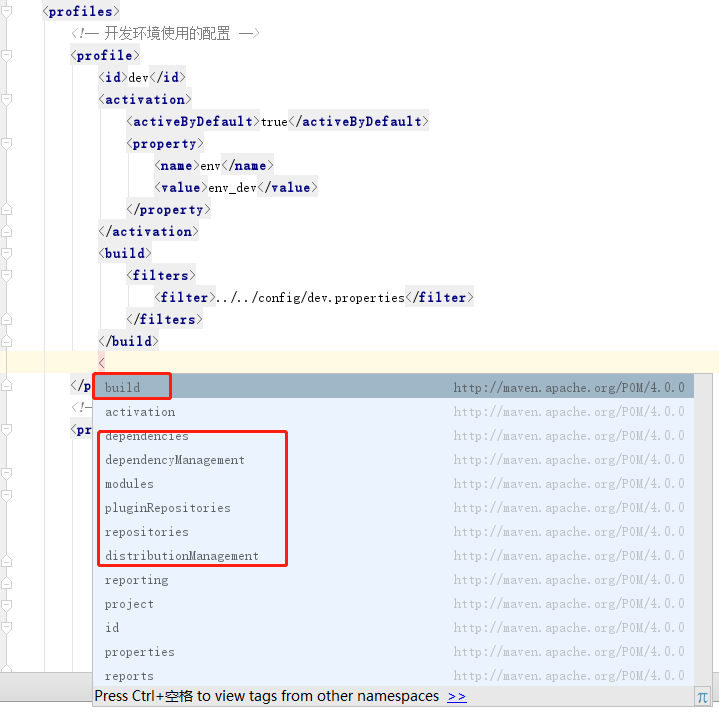profile元素可以用于对不同环境的构建进行配置,project中包含的元素,在profile元素中基本上都有,所以profile可以定制更复杂的构建过程,不同的环境依赖的构件、插件、build过程、测试过程都是不一样的,这些都可以在profile中进行指定,也就是说不同的环境所有的东西都可以通过profile元素来进行个性化的设置,这部分的功能有兴趣的大家可以自己去研究一下,截个图大家感受一下: