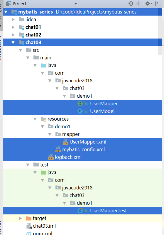 整个mybatis系列的代码采用maven模块的方式管理的,可以在文章底部获取,本次我们还是在上一篇的mybatis-series