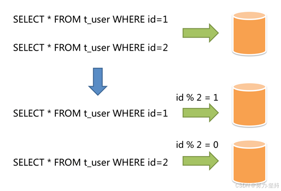例如:根据主键分片,偶数主键的记录放入0库(或表),奇数主键的记录放入1库(或表)