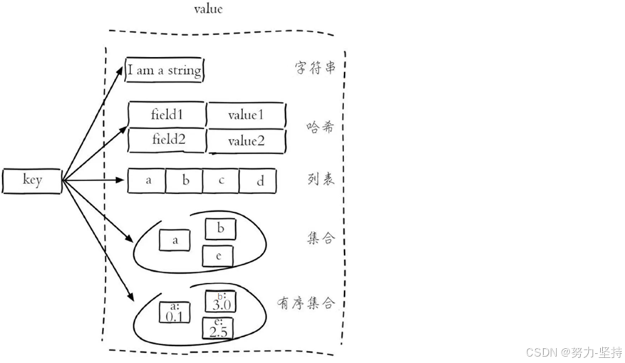 Redis存储的是key-value结构的数据,其中key是字符串类型,value有5种常用的数据类型:
