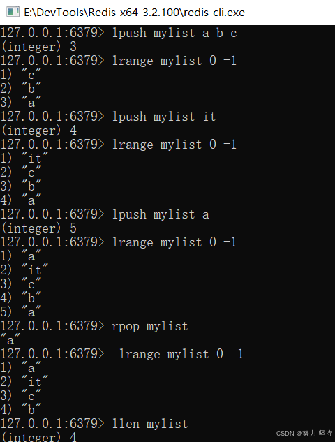 LRANGE key start stop 获取列表指定范围内的元素 0到2 0到-1(全部)