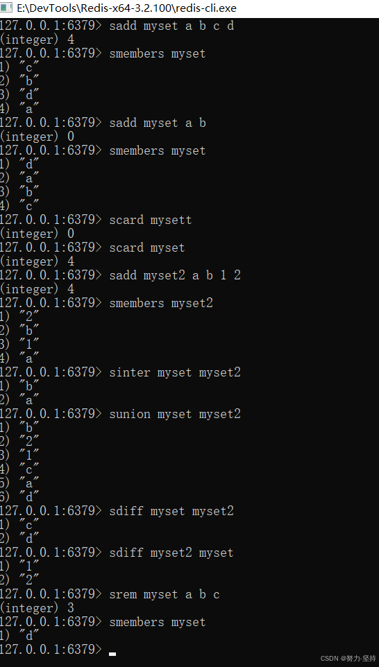 Redis set 是string类型的无序集合。集合成员是唯一的,这就意味着集合中不能出现重复的数据,常用命令: