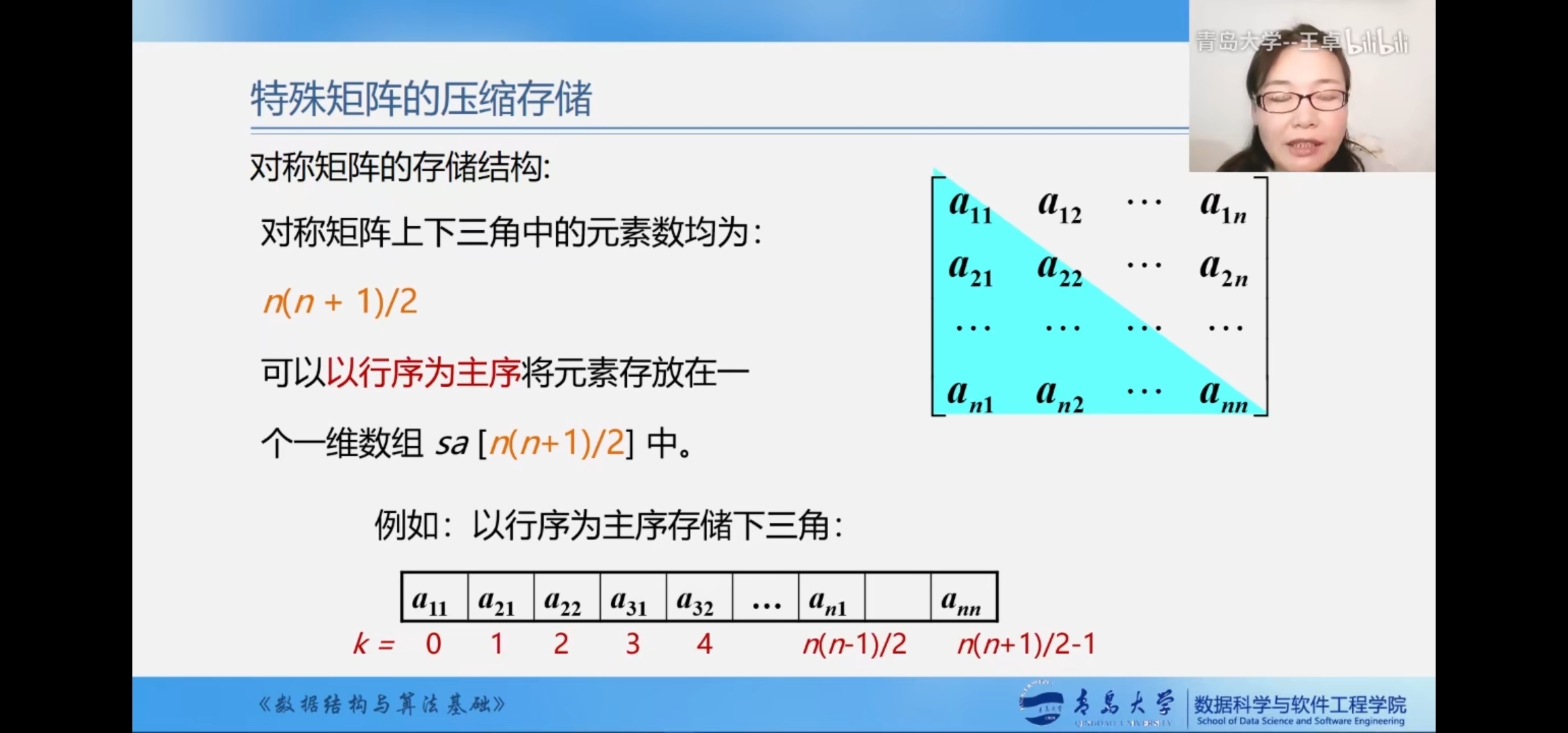 存储方法:只存储下(或者上)三角(包括主对角线)的数据元素。共占用n(n+1)/2个元素空间。