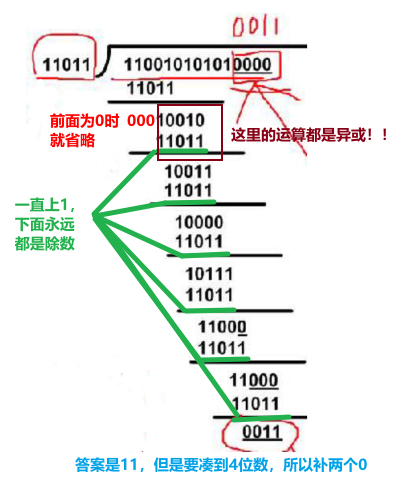 进行模 2 除法( 即忽略借位, 位与位之间是异或运算), 一直上1, 最终得出四位的余数, 就是 CRC 校验码