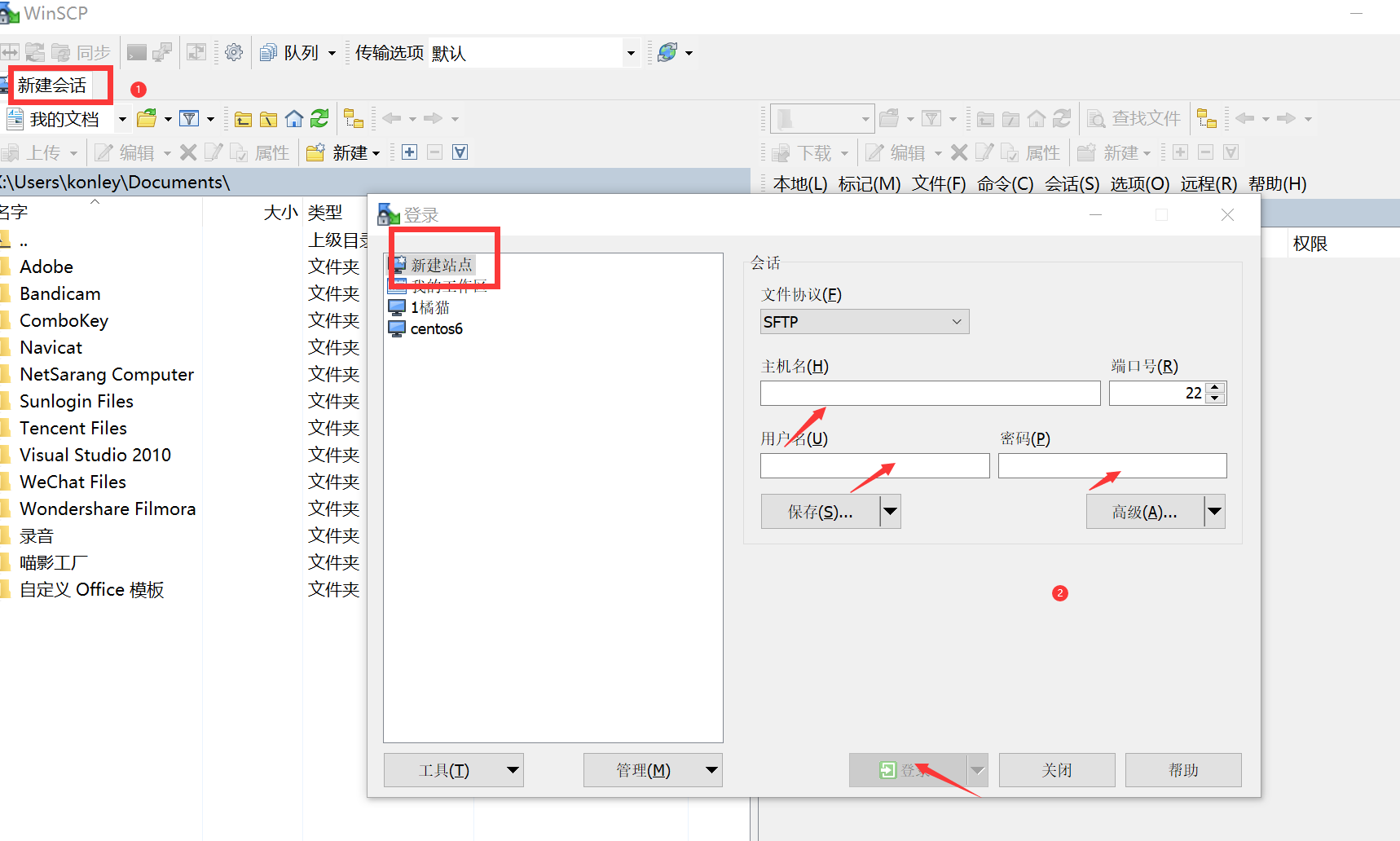 打开winscp,点击左上角的 新建会话 在弹出的选项卡中选择的 新建站点