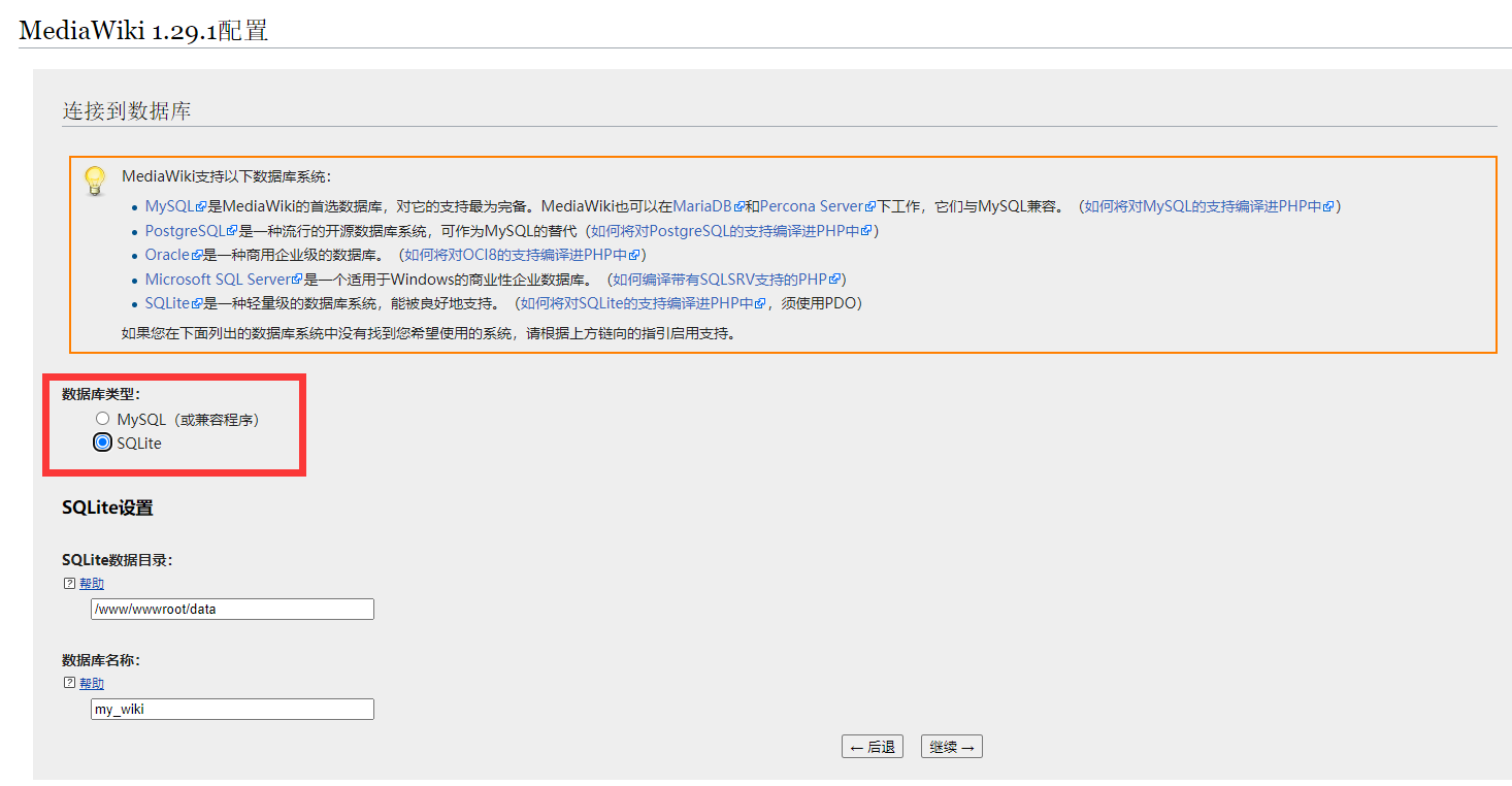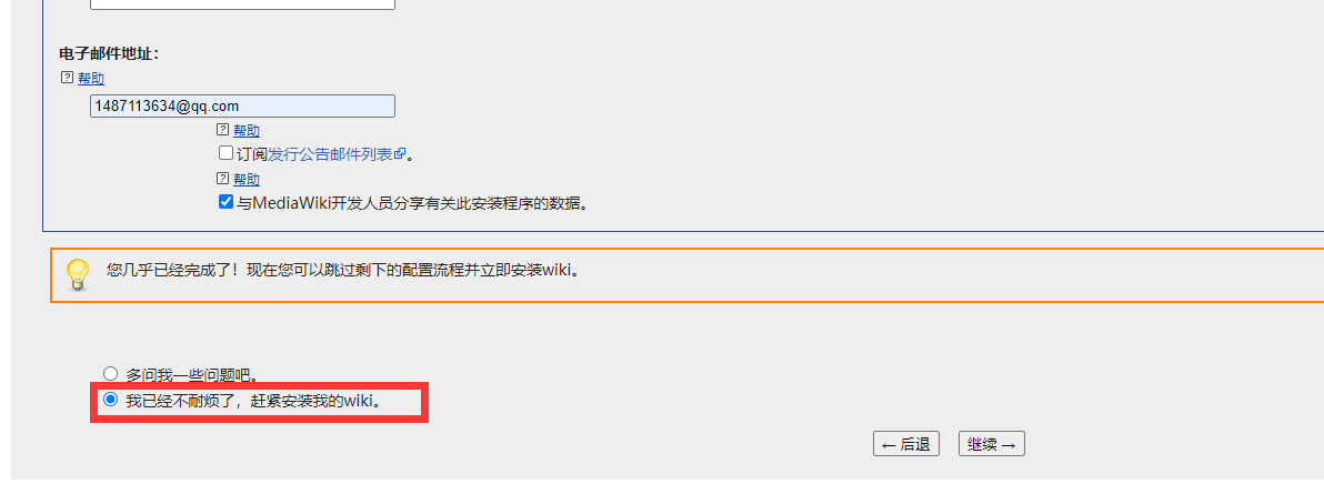 第五步:填写wiki名称和管理员账户信息,选择不耐烦,单击继续